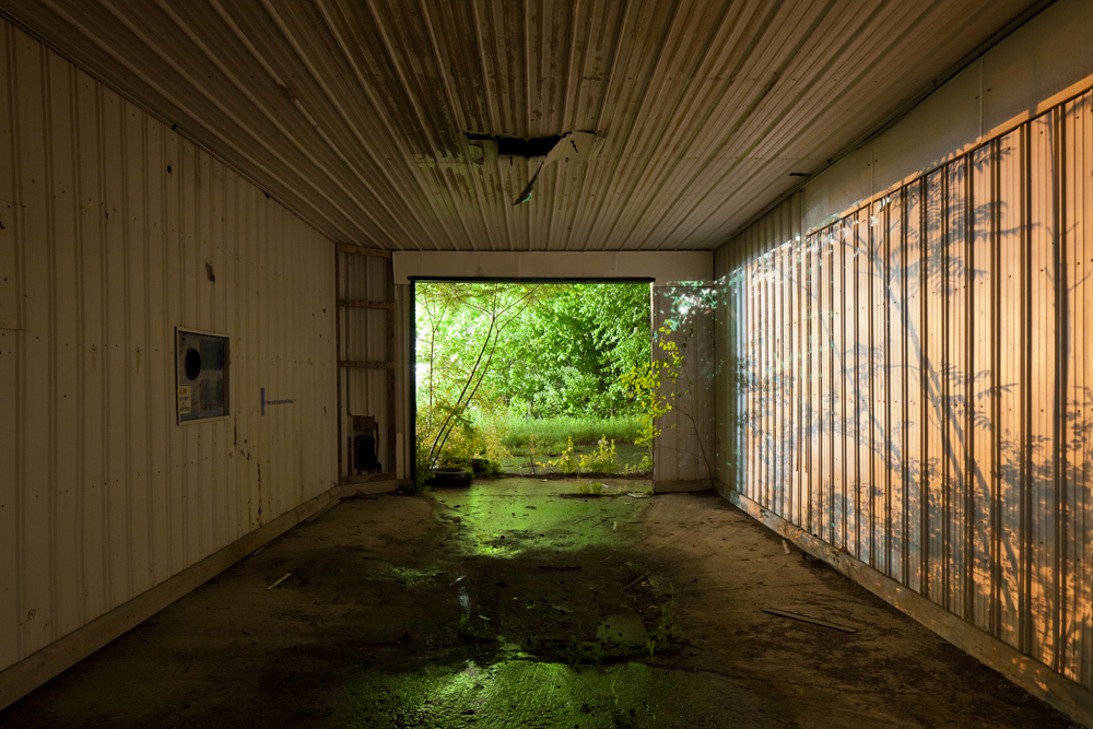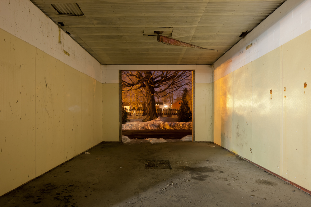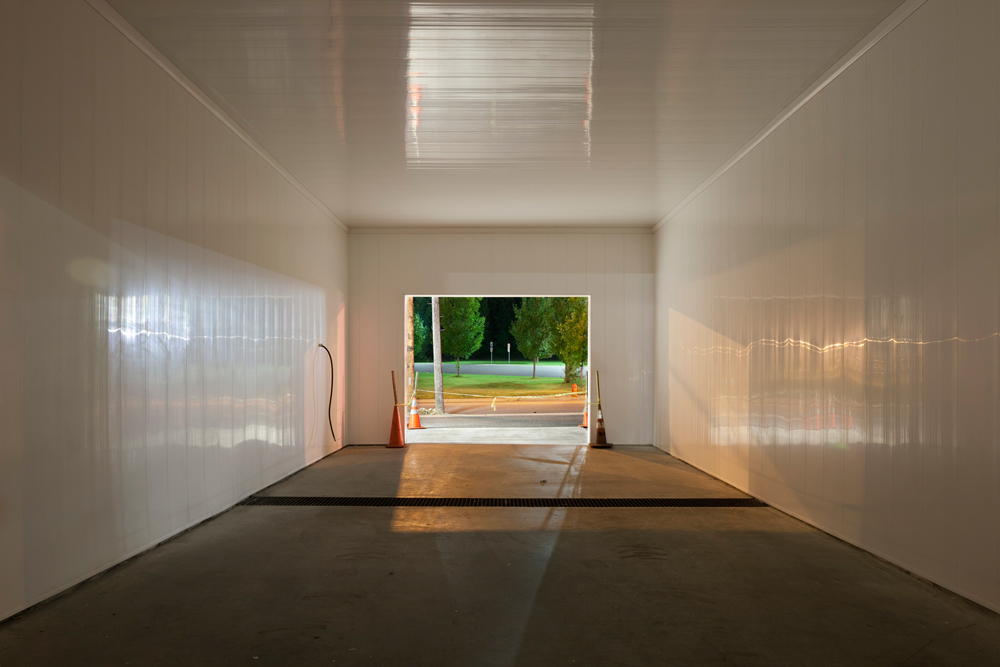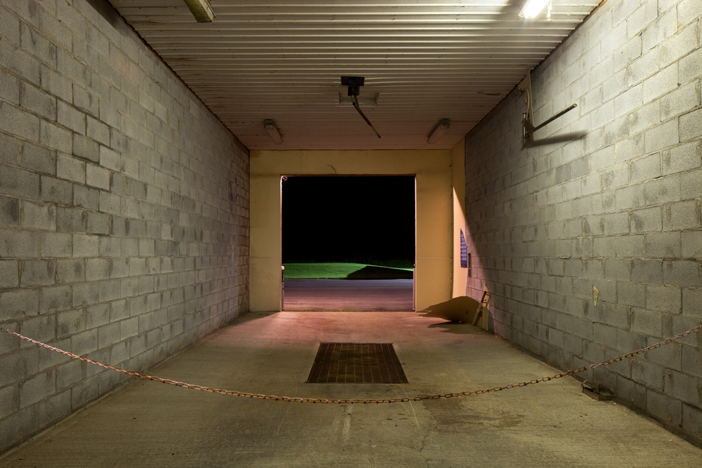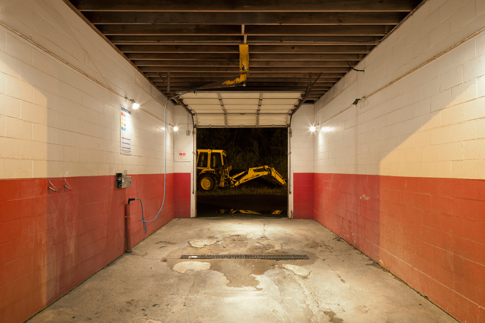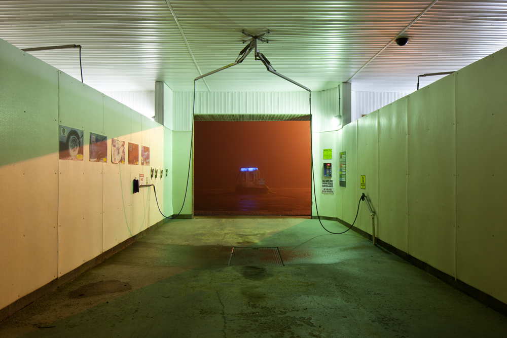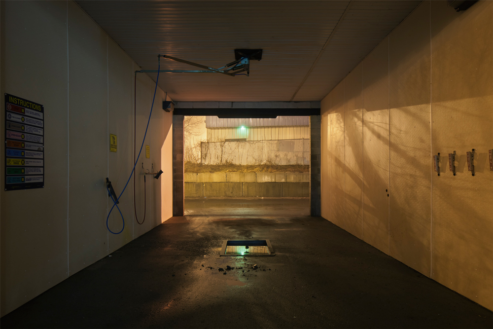 This series examines the relationship between self-service car wash bays and the adjoining landscapes. In their intended function, these semiprivate bays take the place of the family driveway to restore our cars’ fleeting luster. The spaces appear secluded as they are captured at night with exposures timed around the fluctuating cycles of street lights and traffic patterns. Variations in seasonal weather conditions, as well as the shifting balance of interior and exterior light transform these ubiquitous spaces into something unfamiliar.
