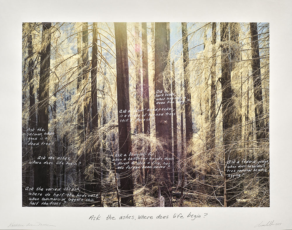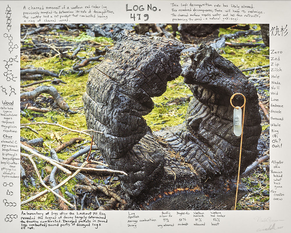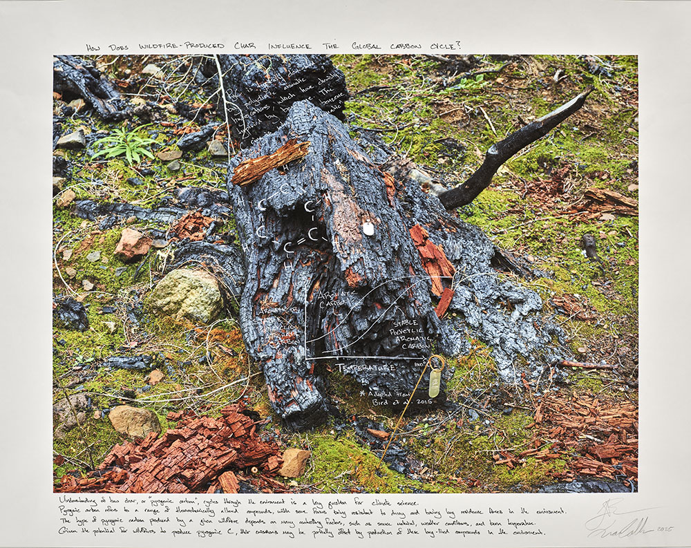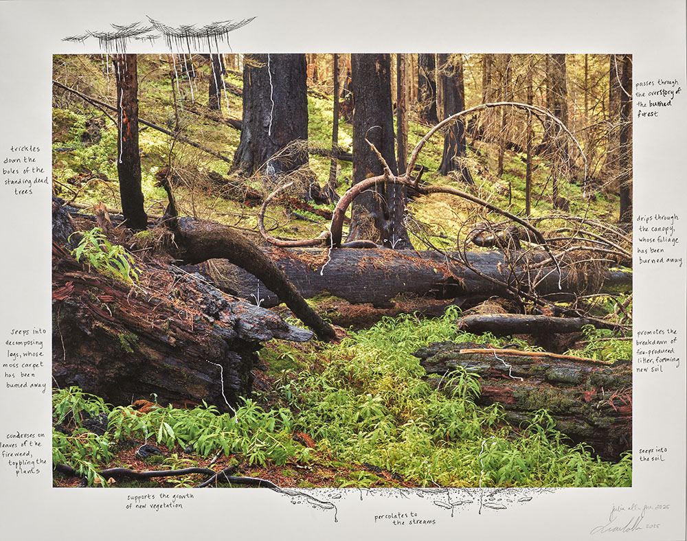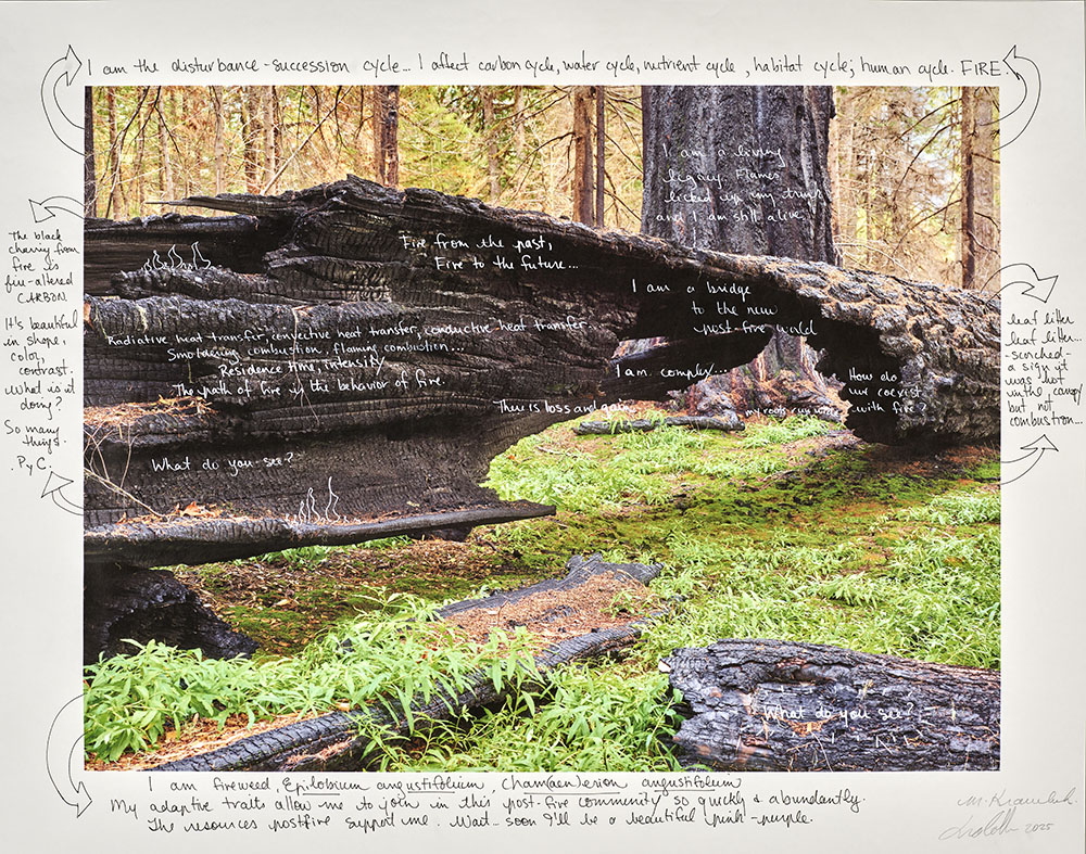 As part of my larger Naturalists of the Long Now project, these prints are direct collaborations with scientists and writers who conduct research at the experimental forest. Over a period of three years, (2021-2024) I photographed portions of the forest both before and after a significant portion of the forest burned. I asked my collaborators to reflect on the landscapes and then annotate directly onto the inkjet prints. Each annotated two prints, one of a photograph taken before the burn and the other after the burn.