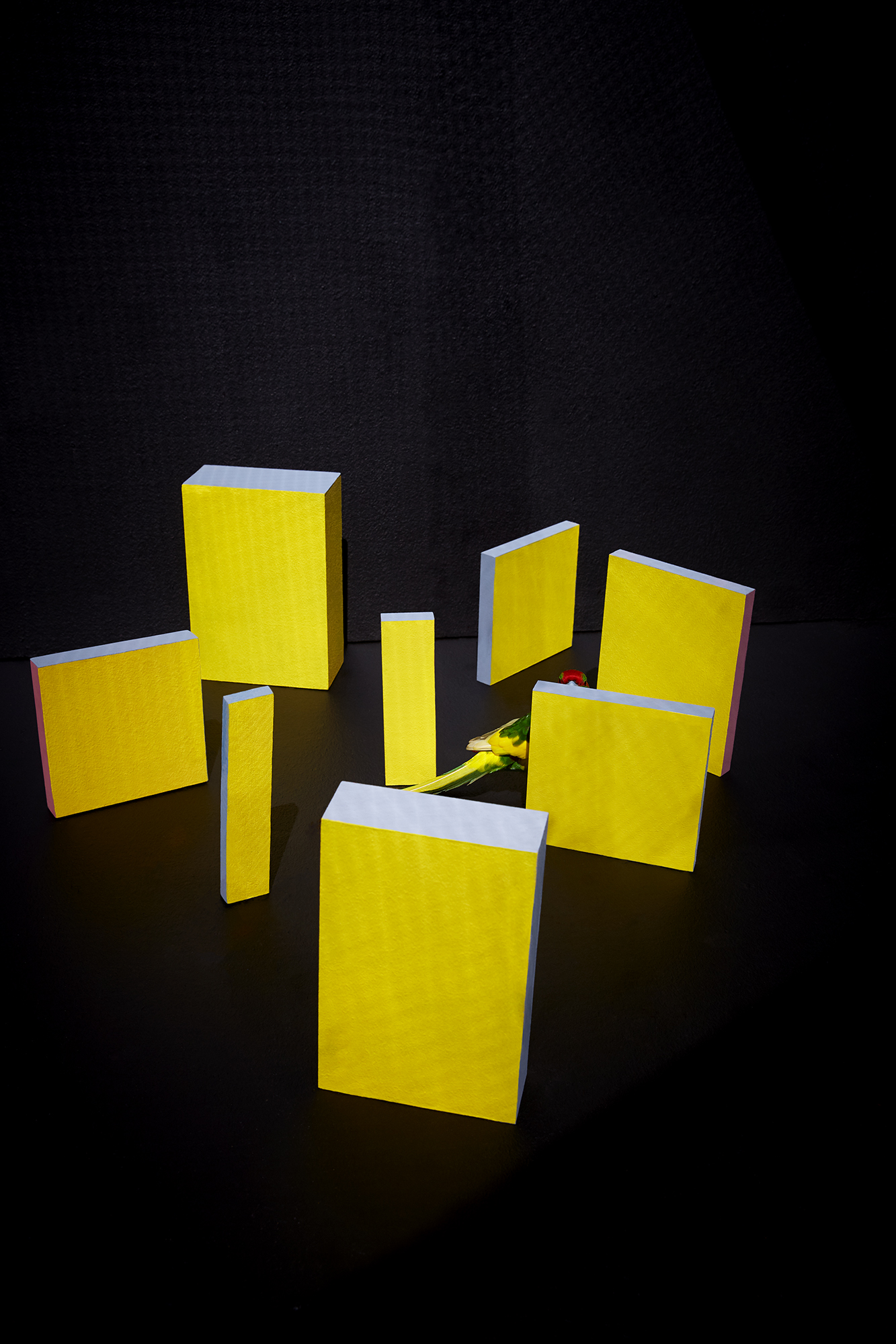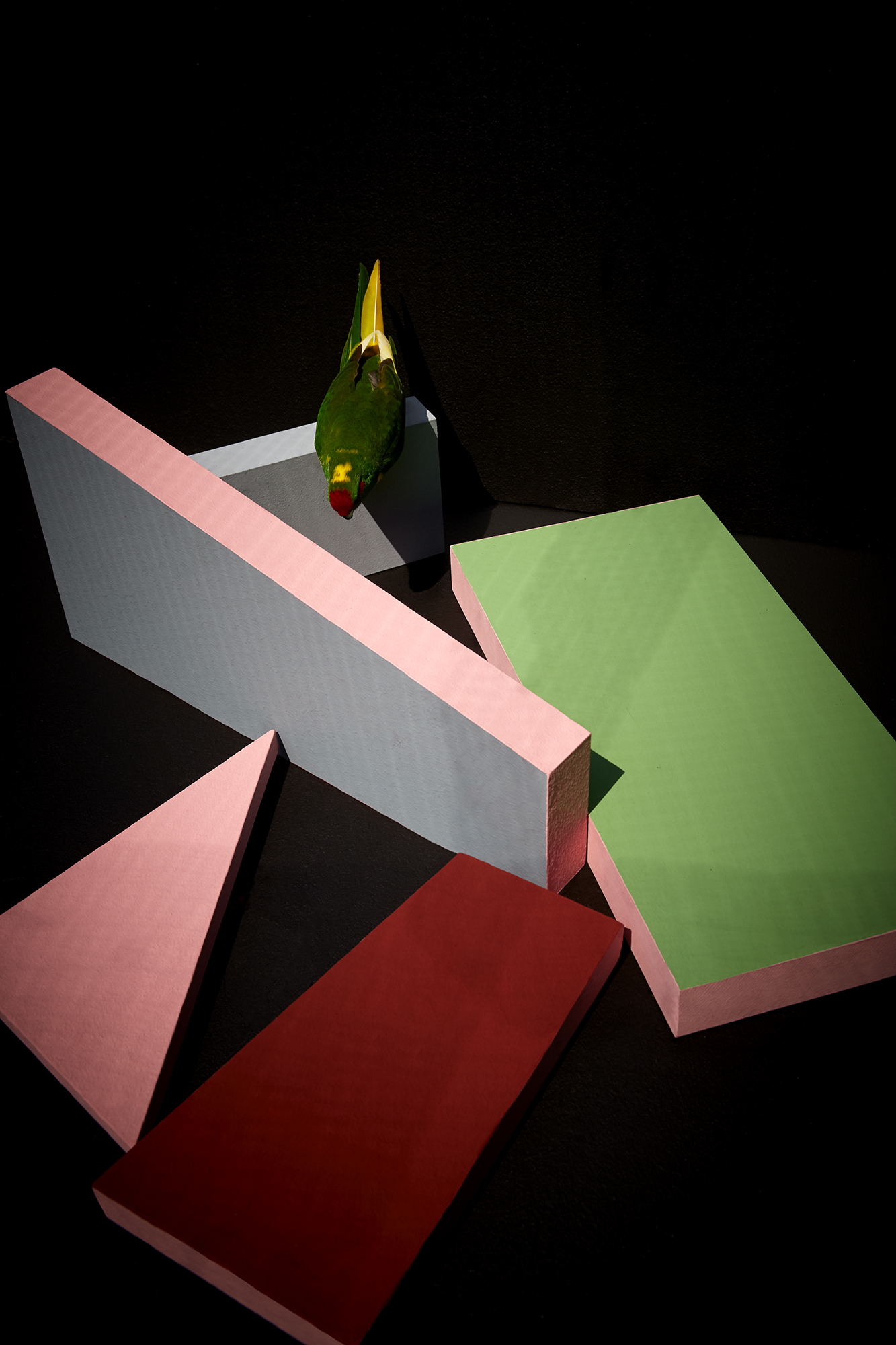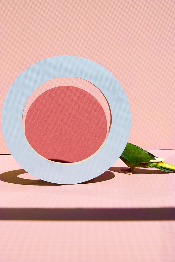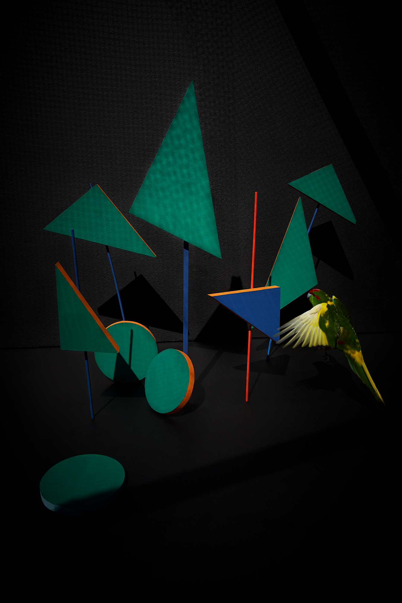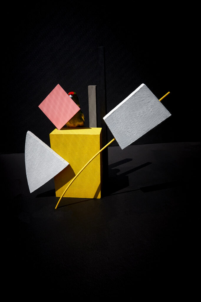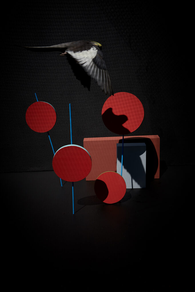 In my series "Composition with Bird", I construct staged environments that reflect the artificial world we impose upon animals—and ultimately, upon ourselves. Geometric shapes in vivid colors suggest order, structure, and control, while the presence of a living bird introduces unpredictability, vulnerability, and vitality. These birds navigate spaces that are built, not grown; curated, not evolved. Their flight is both real and metaphorical—a moment of resistance within a constructed system.